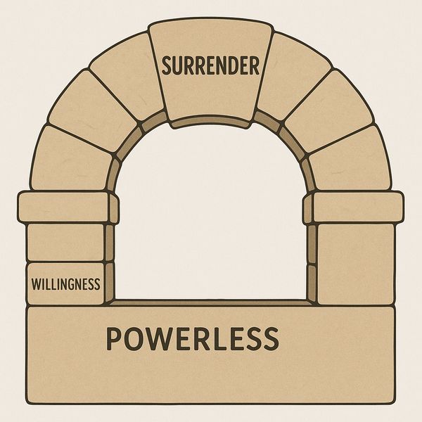 The Arch of Freedom represents the spiritual architecture of recovery and regulation — a journey from striving to surrender. Its foundation is Powerlessness, the moment we release the illusion of control over people, places, and things. Its cornerstone is Willingness, the choice to open our hearts to possibility and guidance. And its keystone is Surrender, the final piece that locks everything into harmony — the point where self-will gives way to grace.
